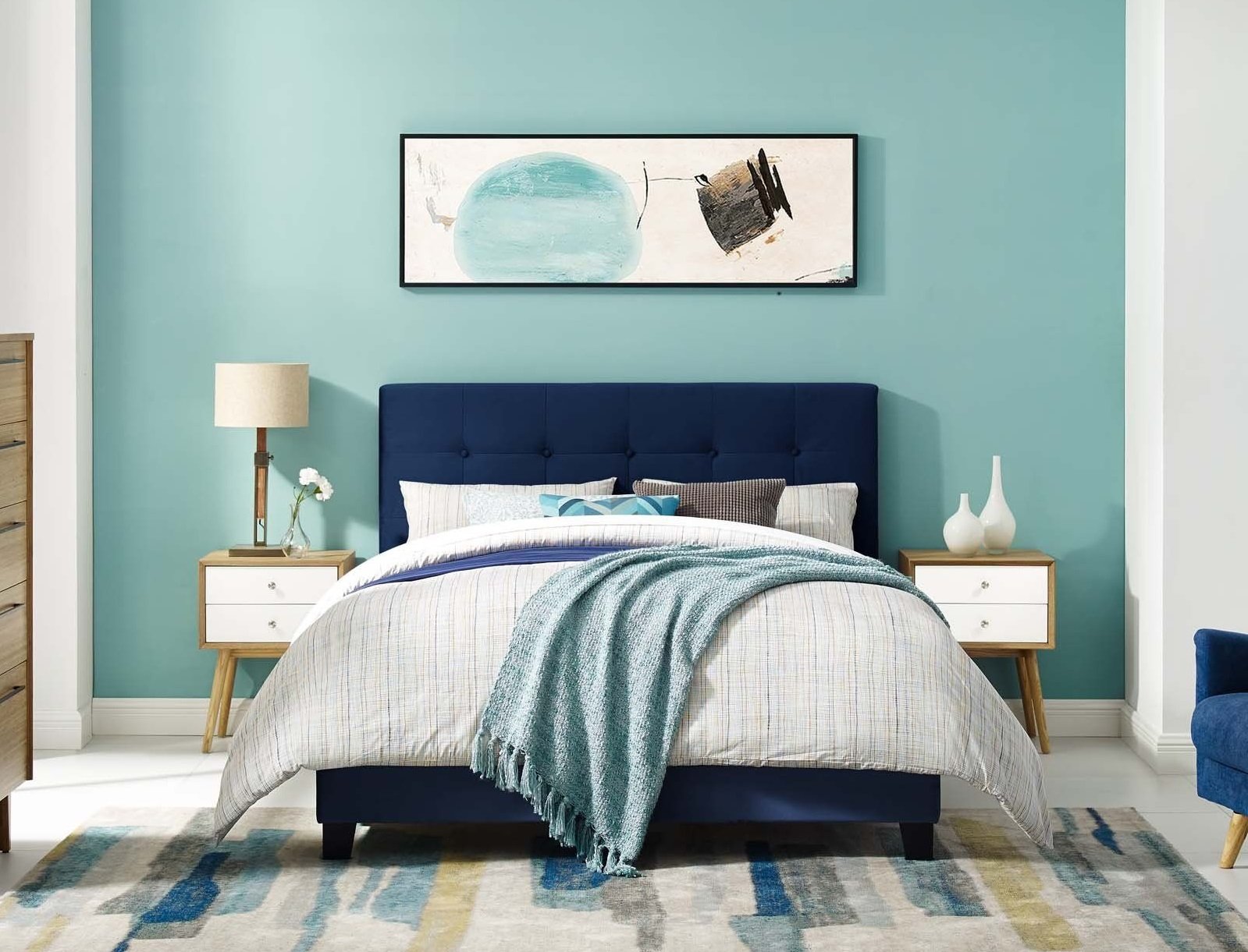 O azul é normalmente associado ao mar, ao céu e à pureza e serenidade. Em seus tons mais claros, traz calma, estimulando a contemplação, uma sensação mais alegre, e é comum sua aplicação nos quartos. Nas tonalidades mais escuras, está relacionado ao poder, representa profundidade de sentimento e amplitude ao ambiente.