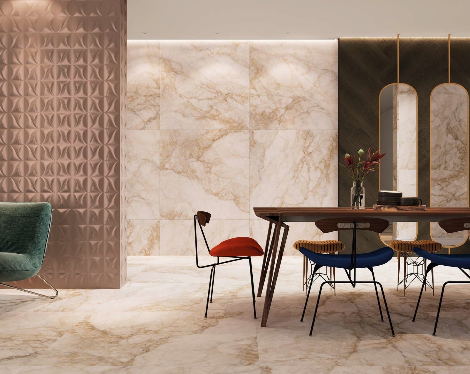 Como destaque, sua tradicional coleção de mármores, que traz referências de rochas clássicas e raras, foi complementada com o Statuario Superior e o Travertino Navona. O desenvolvimento do primeiro foi inspirado em um dos mais conceituais mármores da região de Carrara, na Itália. O fundo branco do revestimento contrasta com veios prateados, proporcionando sofisticação e equilíbrio aos ambientes. Já o versátil Travertino Navona, que apresenta uma longa história na arquitetura e na decoração, se confirma como um produto atemporal, ideal para projetos que buscam beleza e personalidade.