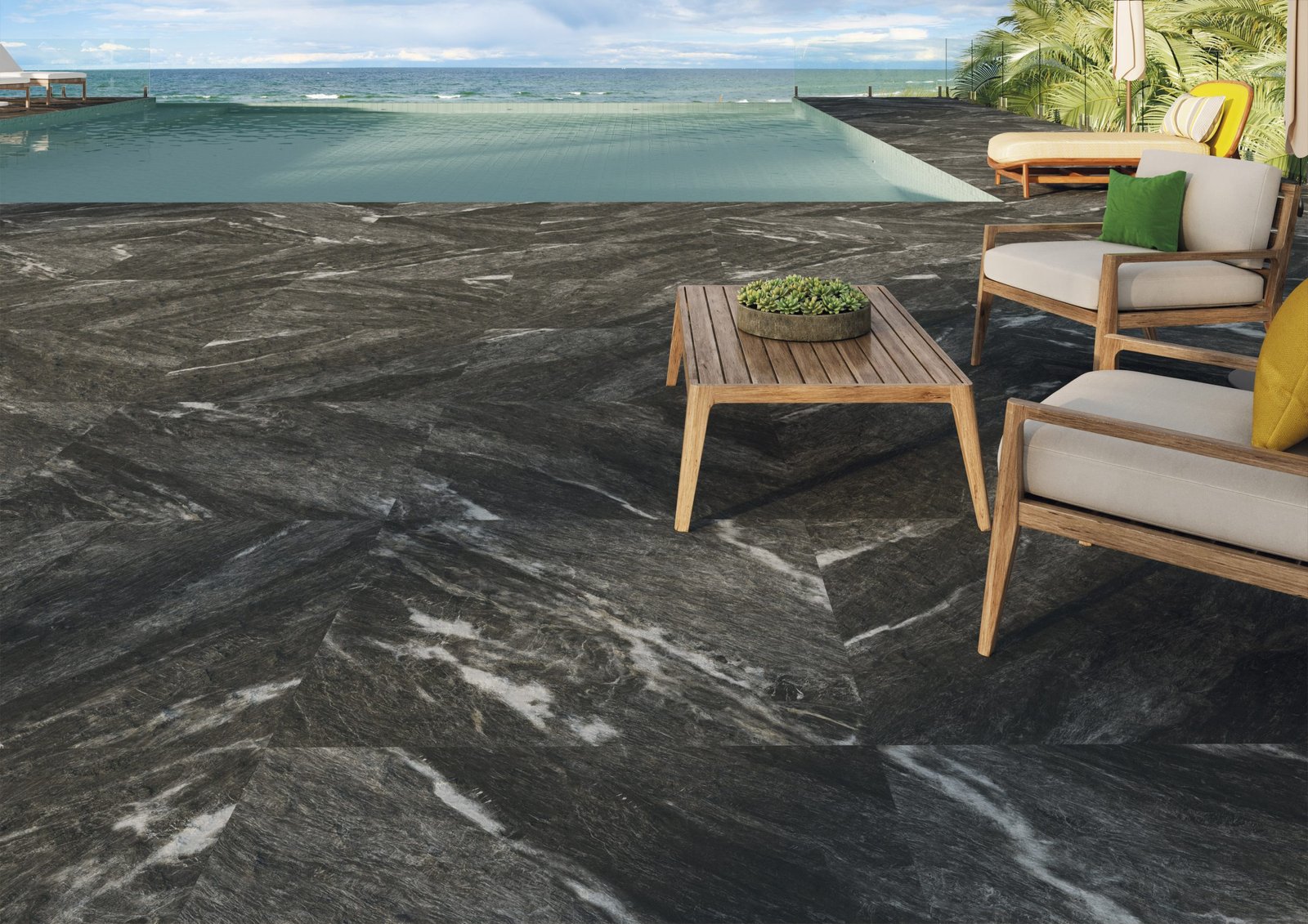 Outro destaque une a naturalidade das pedras escuras com a resistência e beleza do porcelanato, na Coleção Noturno. São peças que propõem movimento e ousadia aos ambientes. A linha traz revestimentos escuros com nuances esbranquiçadas, promovendo um efeito exclusivo. Com peças no formato 120×120 cm, os produtos estão disponíveis em acabamentos natural e antiderrapante, possibilitando sua aplicação em todos os ambientes, internos e externos.