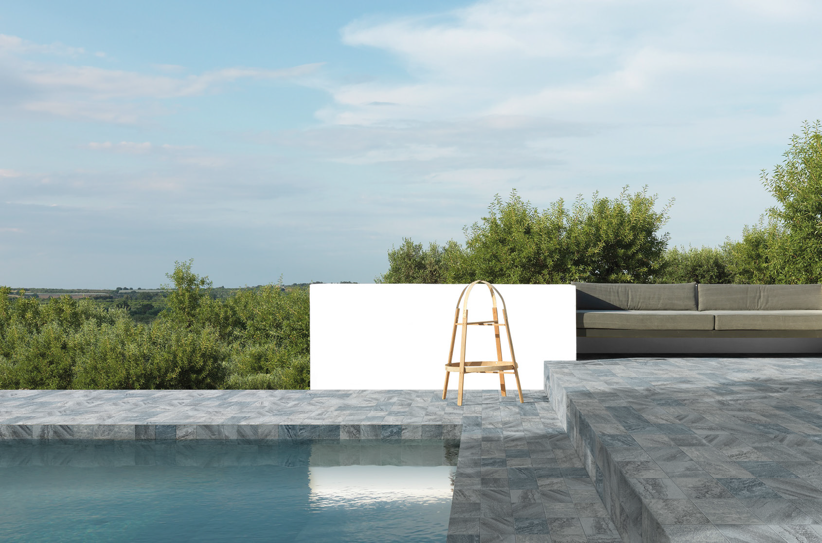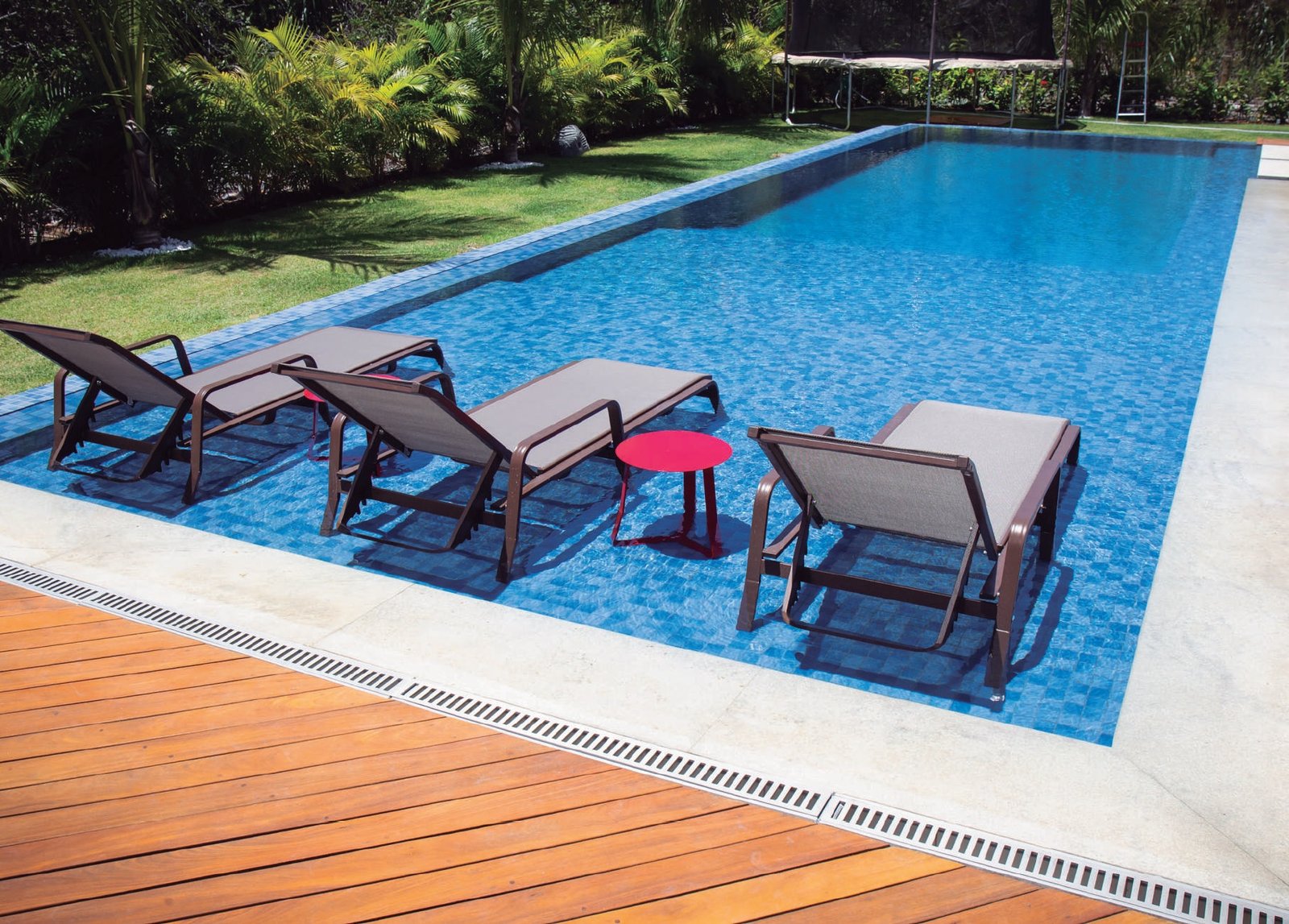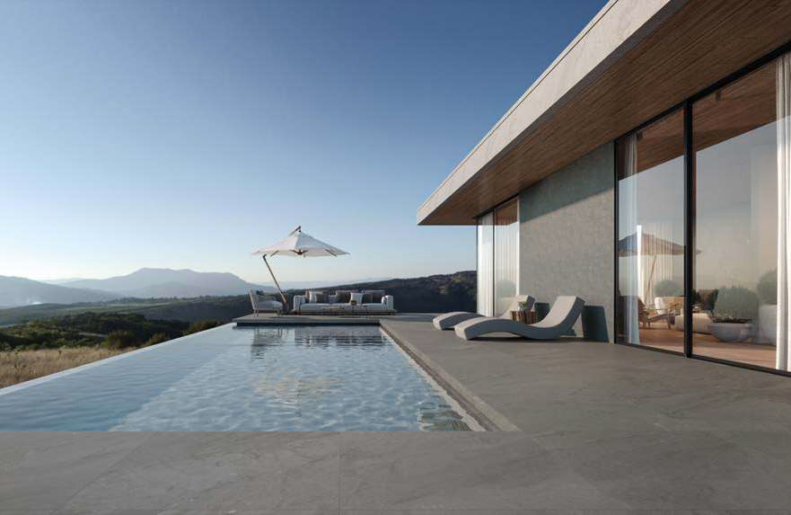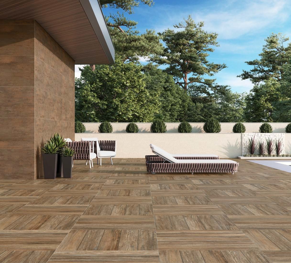 Ao escolher o revestimento para a parte externa, ao redor da piscina, é preciso pensar no conforto e na segurança que ele vai proporcionar, não apenas no design. A grande tendência para essas áreas é o porcelanato, que traz modelos atérmicos e antiderrapantes, com acabamento amadeirado, cimentício ou com aspecto de pedras naturais. Existem produtos específicos para o deck, que evitam a absorção da água e são mais resistentes ao sol.