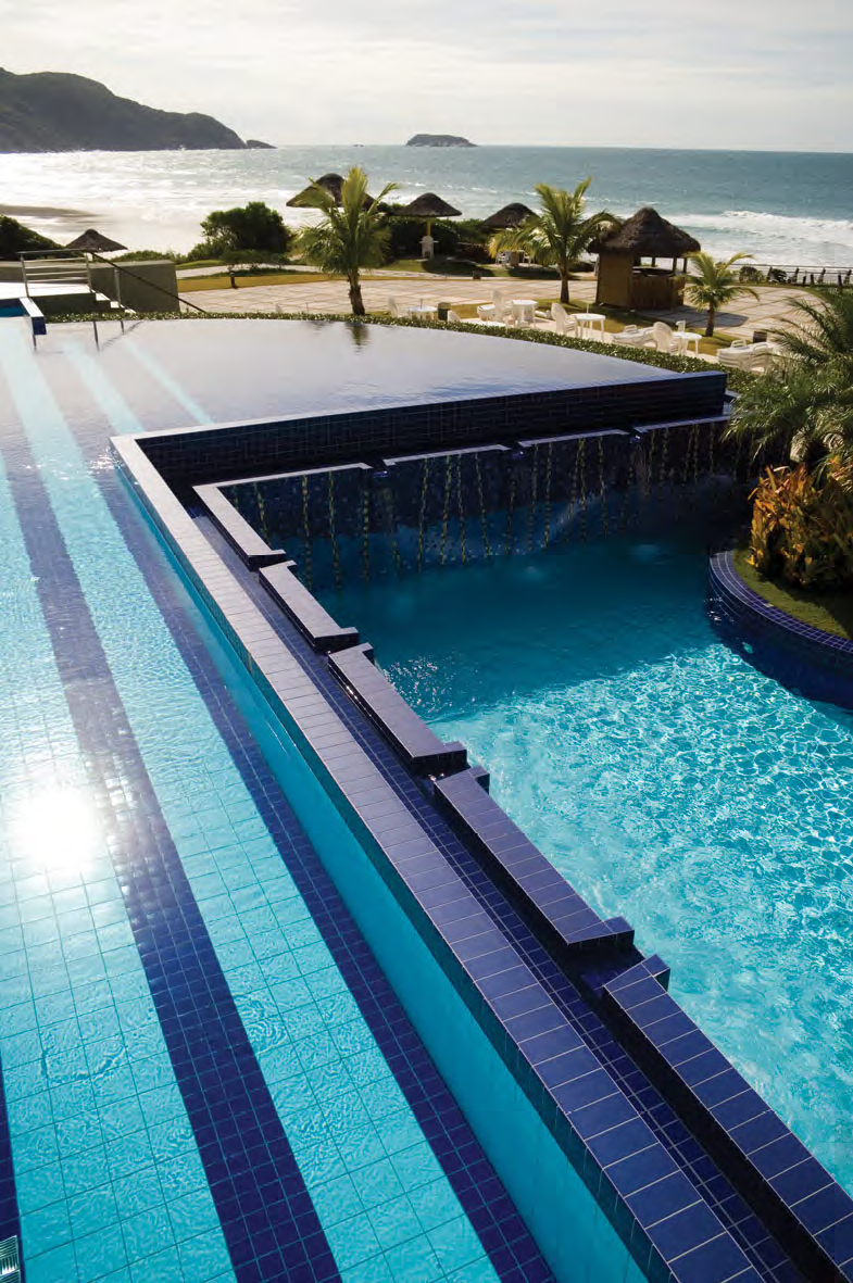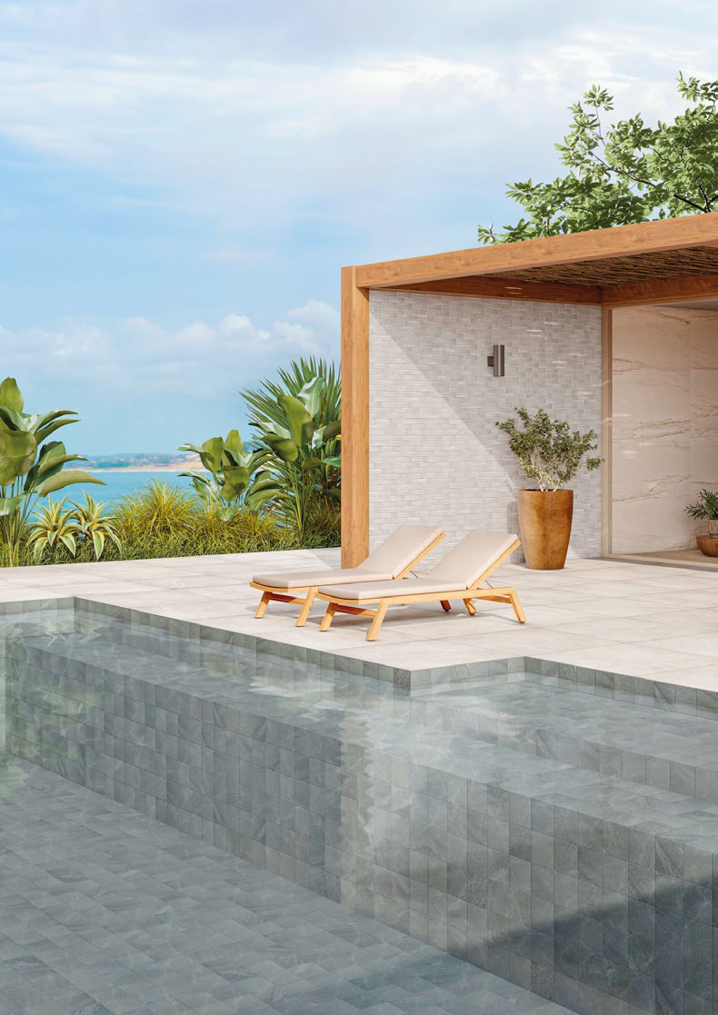 Entre as opções de produtos estão as pastilhas de porcelana, que são mais versáteis, com possibilidade de adequação a todos os formatos de piscinas, e estão disponíveis em cores e texturas diferentes para cada tipo de aplicação. As linhas vão desde os tons mais claros e mesclados, que conferem luminosidade e movimento, aos mais escuros, que proporcionam um aspecto de maior profundidade.