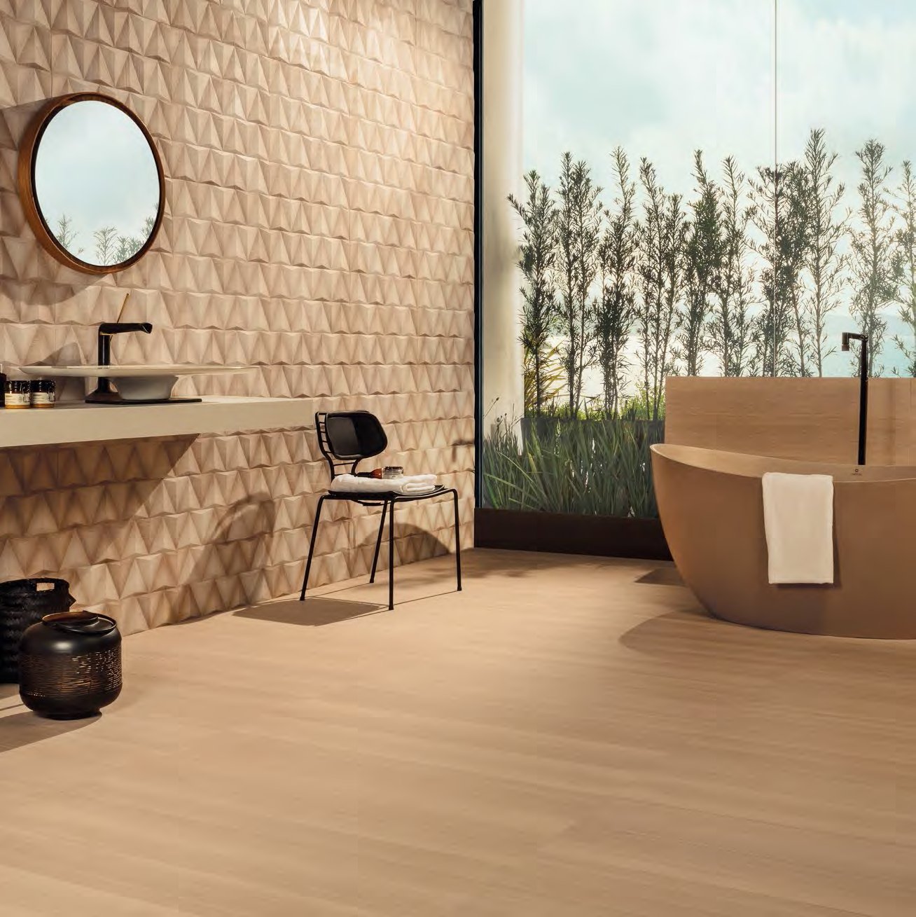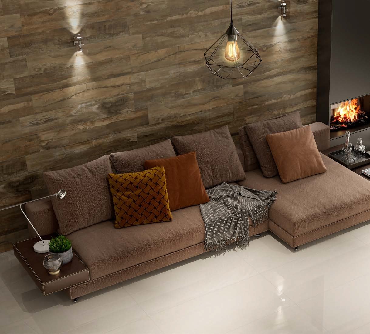 Os acabamentos amadeirados também continuam em alta. As novas linhas de porcelanato estão disponíveis em diversas tonalidades, reproduzindo com fidelidade as madeiras mais nobres. Pode ser utilizado em pisos e painéis, deixando os ambientes aconchegantes e com um toque de sofisticação. Por terem tons neutros, combinam com todos os tipos de decoração, incluindo as cores mais vibrantes. O porcelanato é de fácil manutenção e apresenta alta durabilidade.