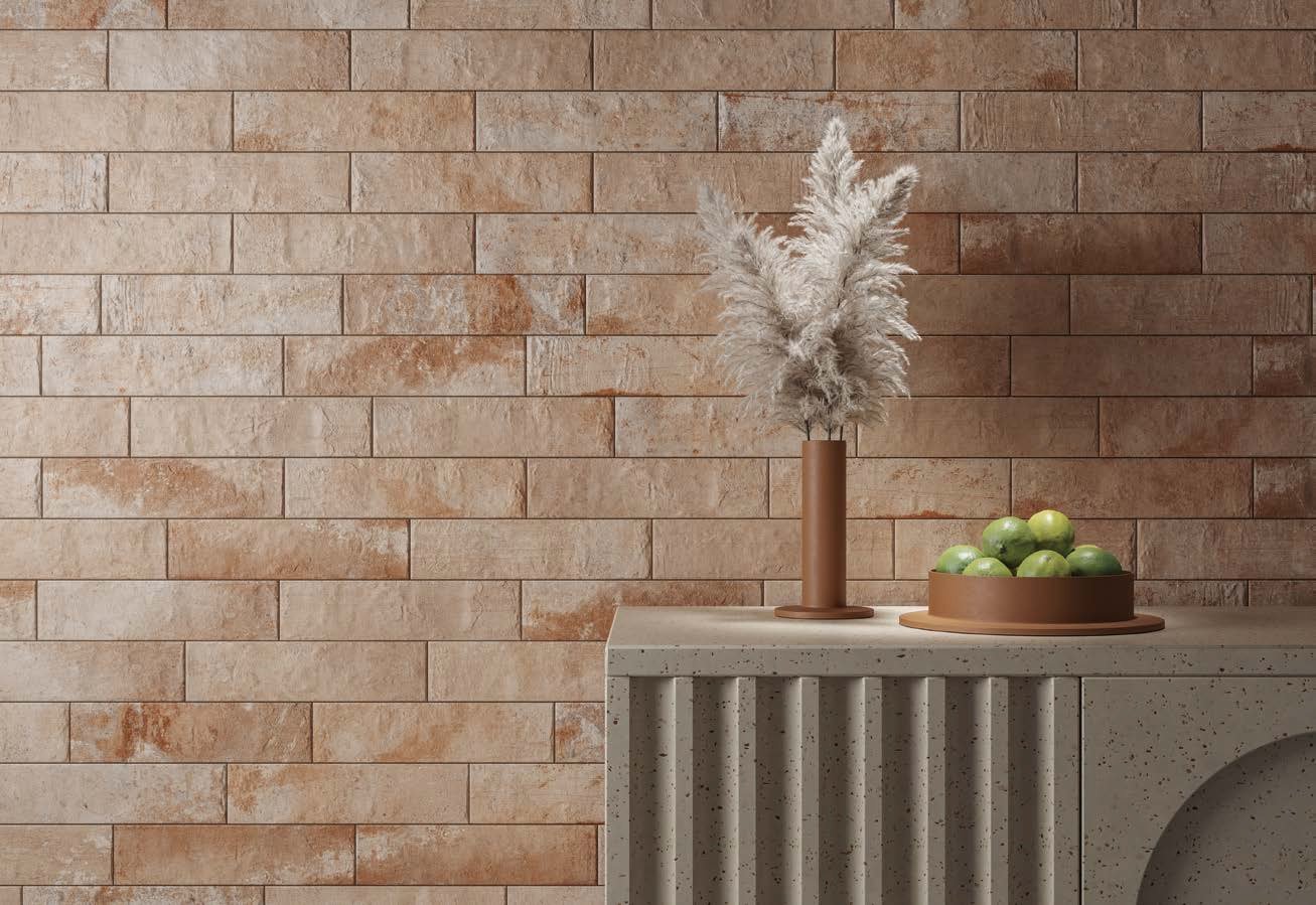 Outra novidade são os azulejos com aspecto artesanal, trazendo textura rústica, desenhos geométricos e cores neutras combinando com as mais vibrantes, em acabamento brilho e mate. Os bricks, ou azulejos com formato de tijolos, também continuam como forte tendência nos tons terrosos e aspecto desgastado – a fusão do clássico com o rústico.