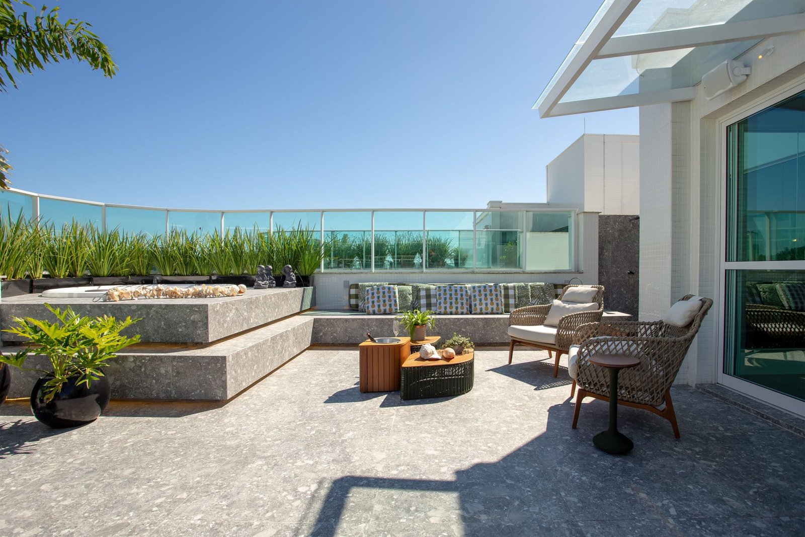 - Composição: porcelanato marmorizado e vegetação criam um ambiente natural