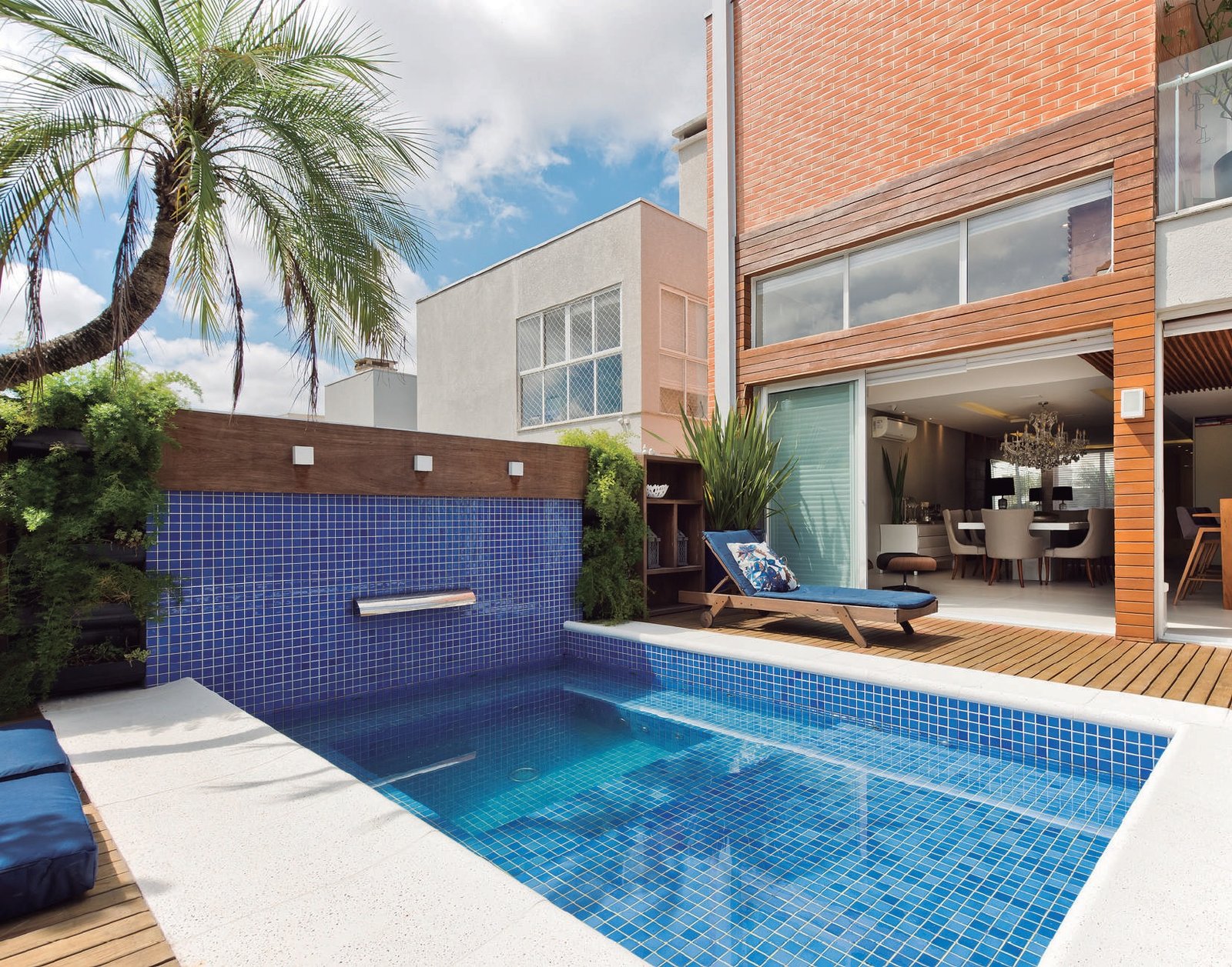 Há quem prefira uma piscina totalmente fora dos padrões do azul e verde. Uma ideia é o projeto da arquiteta Juliana da Mata, que se inspirou na coloração mais escura dos rios e optou pela pastilha Marsala (Linha Gran Mozione), para revestir a piscina integrada com áreas comuns e natureza. Essa pastilha tem acabamento 3D baseado na técnica de pintura espatulada e propiciou ao espaço um visual exclusivo, transmitindo a sensação de movimento, luminosidade, aconchego e serenidade.