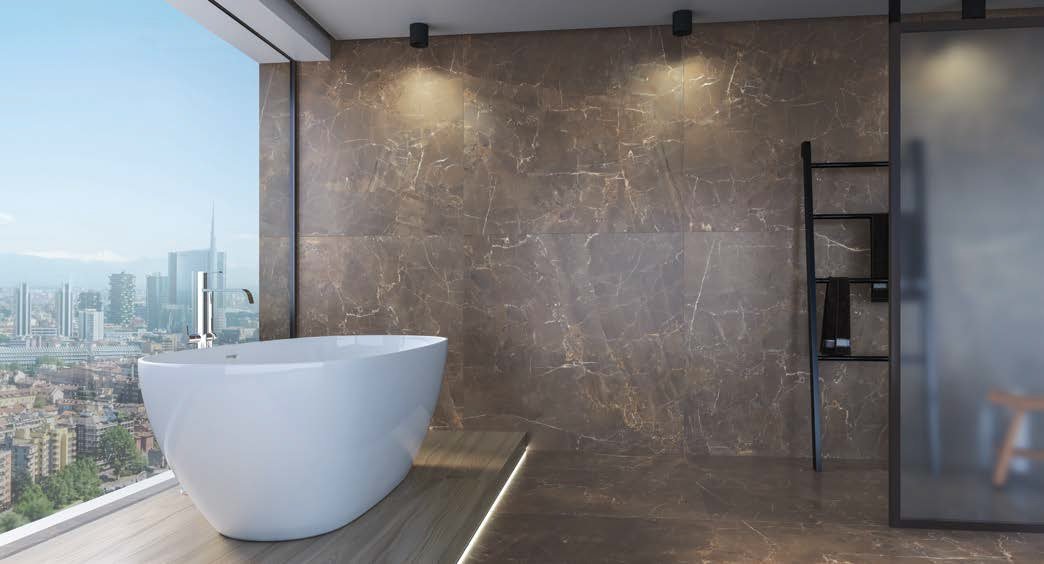 Inspirada na tonalidade terrosa do mármore Bronze Armani, a série Marble Sorrento traz uma superfície marcante, com o contraste do marrom escuro e veios em tons mais claros. A estética impecável, o amplo formato das peças e a nobreza dos acabamentos reforçam a autenticidade do mármore e são um convite a uma atmosfera de requinte.
