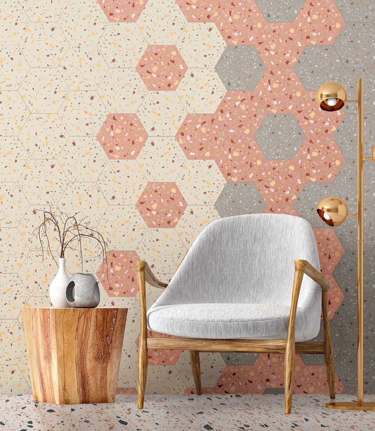 Uma das linhas que tem feito grande sucesso desde o seu lançamento, no ano passado, é a Confete, da Ceusa. Inspirado no granilite, esse revestimento remete ao clássico material muito utilizado na década de 1940, em halls de prédios, escadas, cozinhas e áreas de serviço, especialmente por oferecer praticidade e alta resistência. Também foi bastante aplicado em palacetes na Itália.